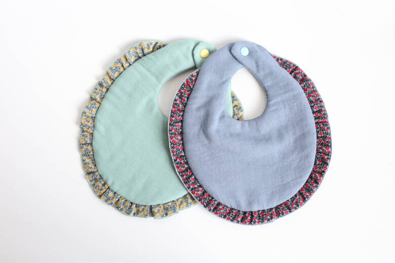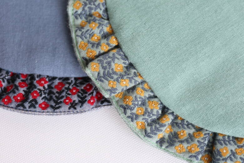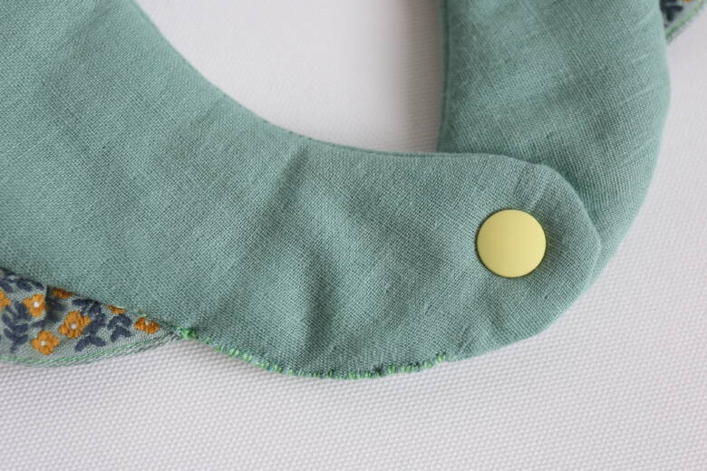 やわらかなガーゼ生地をふんわりと重ね、スタイ全体がやさしい丸みを帯びたフォルムに仕立てられており、赤ちゃんの柔らかな肌に触れても安心できる、そんなやさしさが伝わってきます。内側に芯地を入れて、ふっくら感を出しているのも大きなポイント。実用性とデザイン性のバランスが絶妙です。