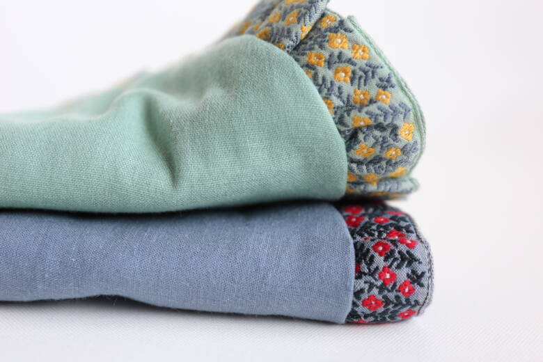 ガーゼの風合いや芯地の使い方からも、贈る相手への思いやりや「可愛く、快適に使ってほしい」という作り手の想いが感じられる、あたたかな布小物です。
