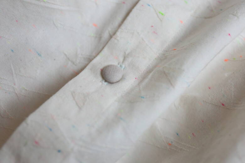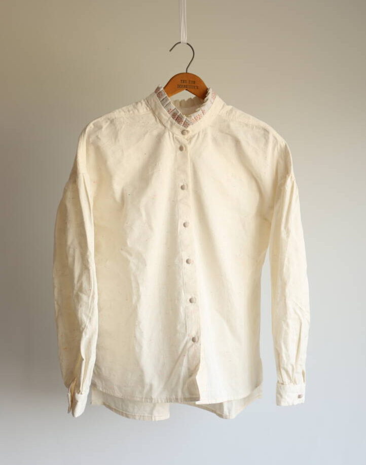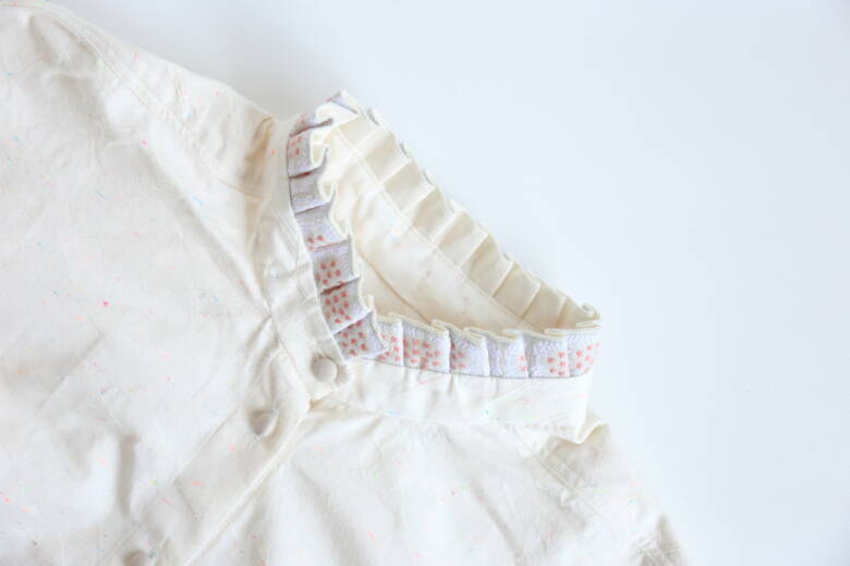 「ピクニックブラウス」という作品名の通り、軽やかなシルエットと優しい色合いのリボンづかいが印象的。布博で見つけた「流れ星」という名前の布地に、リース柄のレピヤンリボンを合わせ、グレーのくるみボタンで優しく引き締めています。ふんわりとした襟元の仕立てもとても可愛らしく、日常の中にちょっとしたときめきを添えてくれるような一枚です。