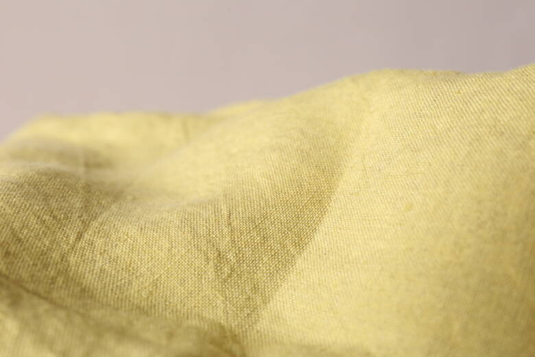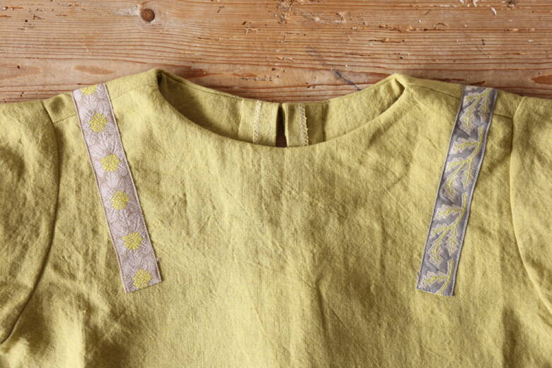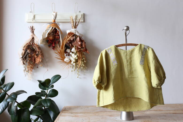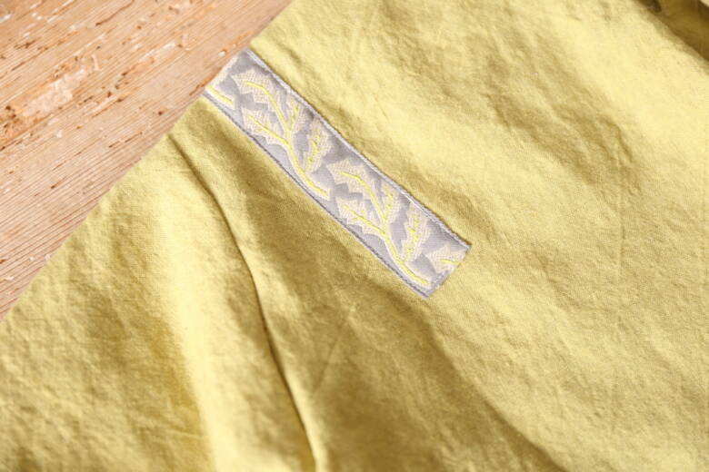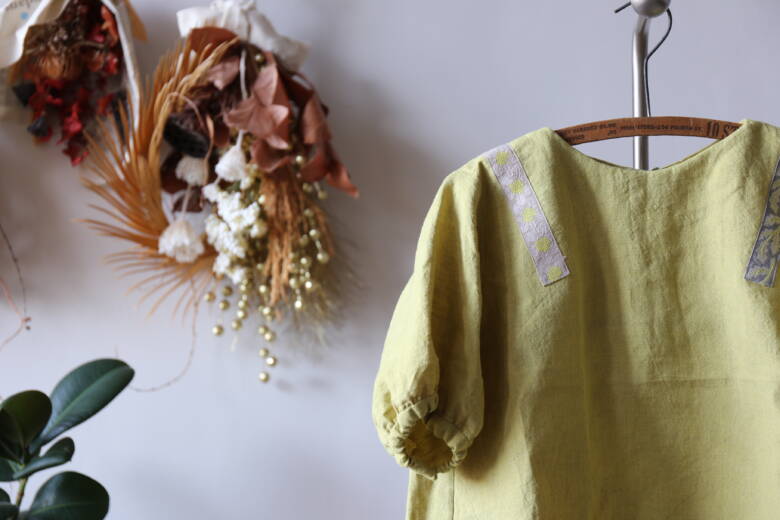 デザイン面でも、ふんわりとしたシルエットと麻のさらっとした風合いがよく合っていて、そこに使われたタンポポと葉っぱのリボンが生地になじみつつ、きちんと主役として引き立っています。生地の黄色とリボンの中の黄色が自然と調和しているのも素敵でしたし、肩から前後に垂れるようなリボンの配置が、“まとう”というテーマを見事に表現してくれていました。