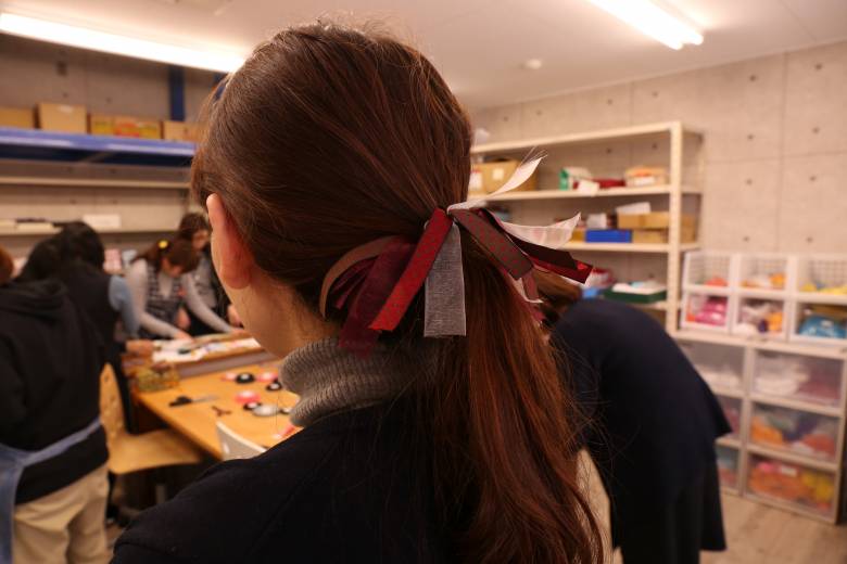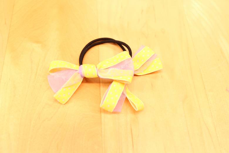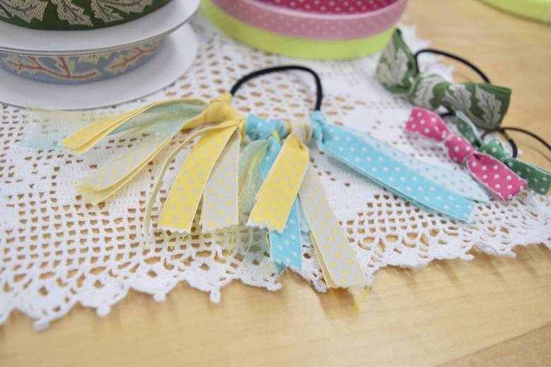 オーガンジーリボンと一緒に結んだり、長さや本数を変えたりして可愛いヘアーゴムが次々完成。