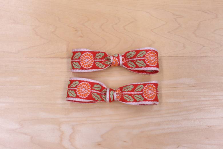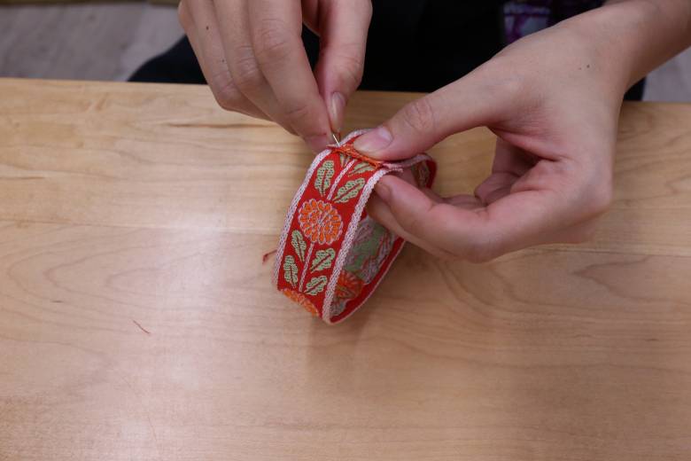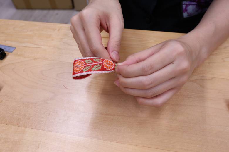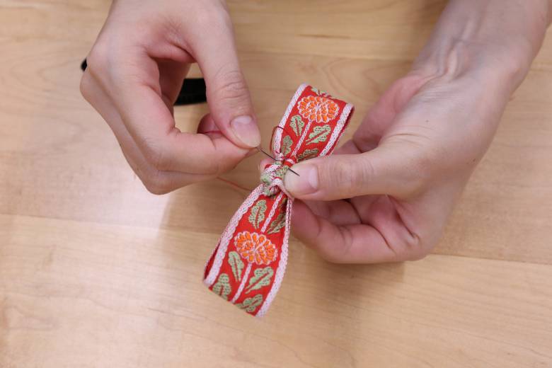 リボンの中心部分に6cmに切ったリボンを巻き、後ろで縫い留めてリボンの出来上がりです。