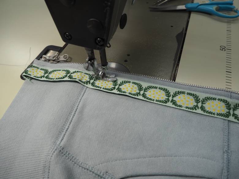 ファスナー側はミシンで付けて、反対側は先にリボン部分にステッチミシンをかけておいて手縫いでまつり縫いをしました。