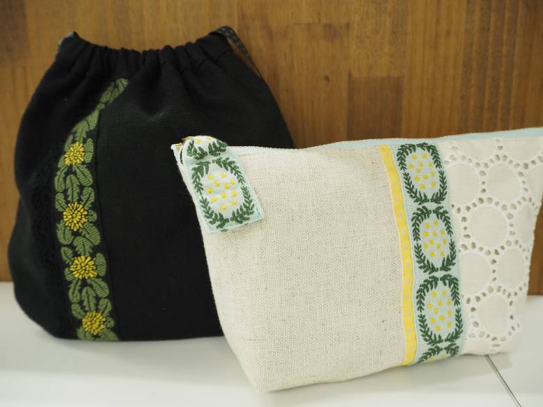 その時用に作ったポーチと巾着袋です。たくさんのお客様にレピヤンリボンにお立ち寄りいただき、リボンやカメラストラップをお買い上げいただきました。