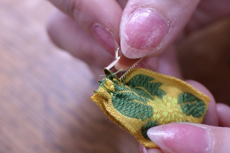 この時のポイントは、柄の位置を完成品を想像しながらカット。