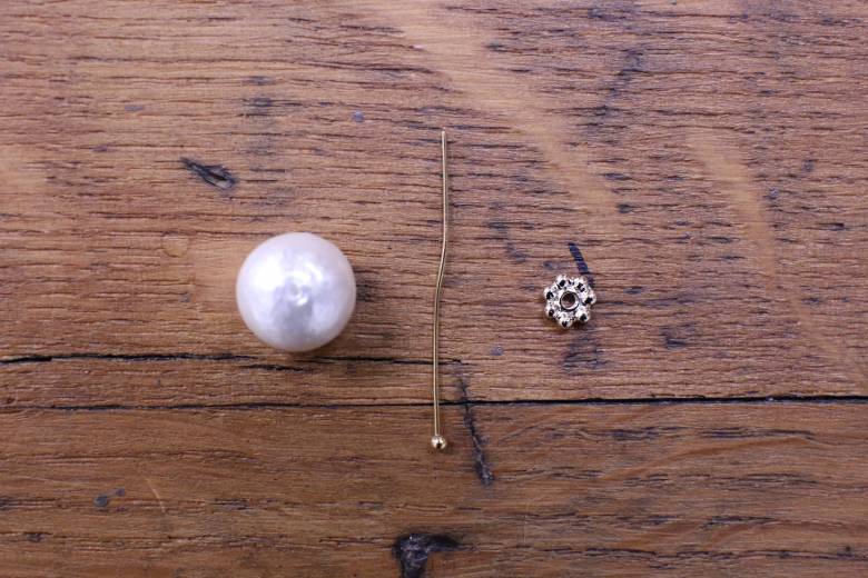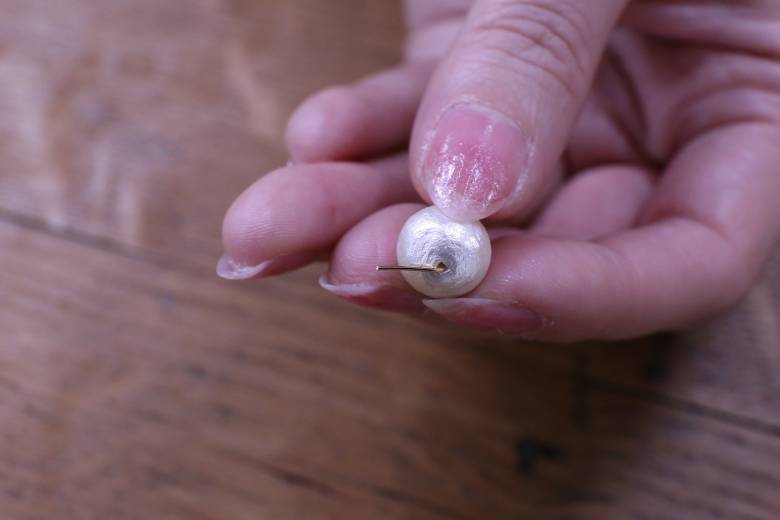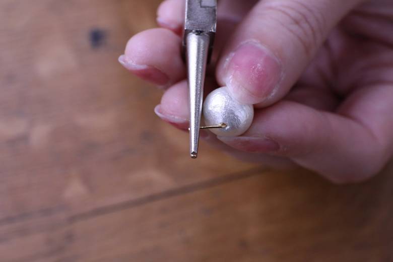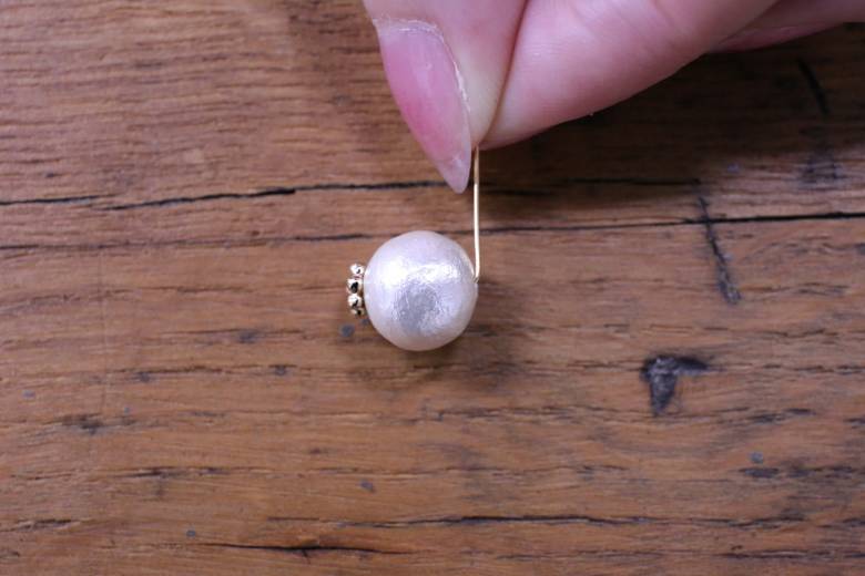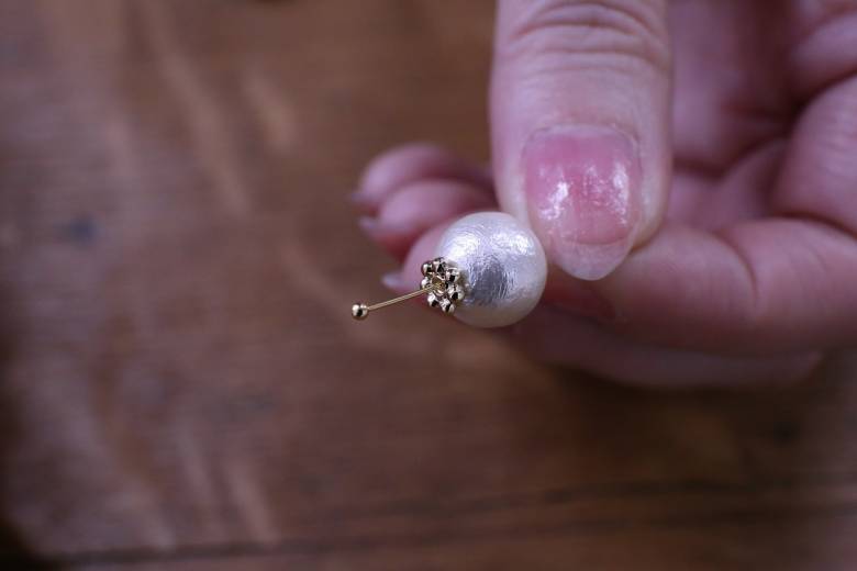 丸ピンにメタルパーツ、コットンパールの順に通して、