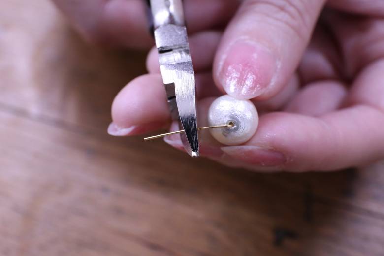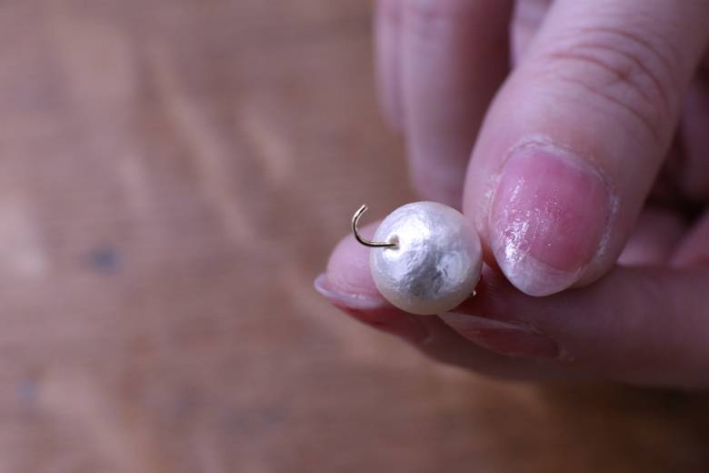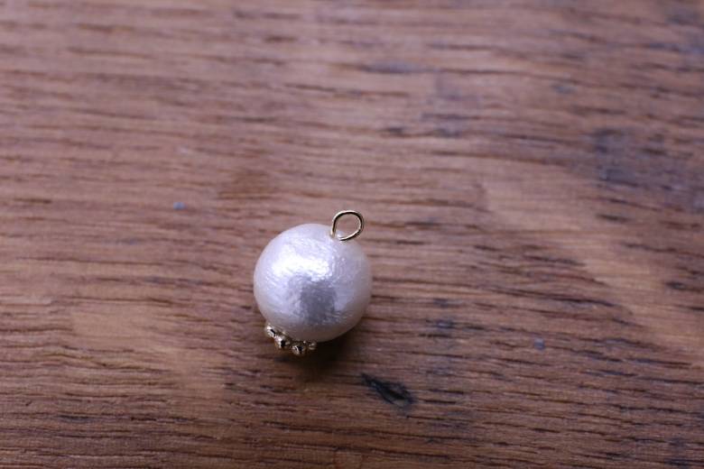 イヤリング本体と、コットンパールのパーツの輪っか部分を通します。
