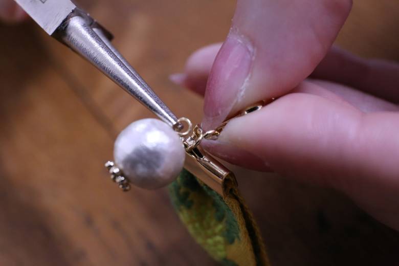 コットンパールが落ちないように気を付けて、二つ目のマルカンを完全に閉じます。