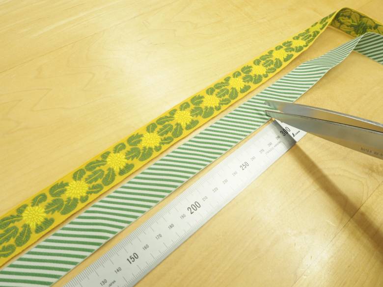 チロルリボンとリバーシブルリボンを30㎝ずつカットします。