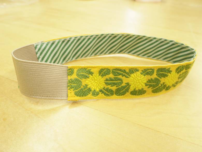 たんぽぽの黄色に新作24㎜リバーシブルリボンの緑のストライプを合わせてみました。