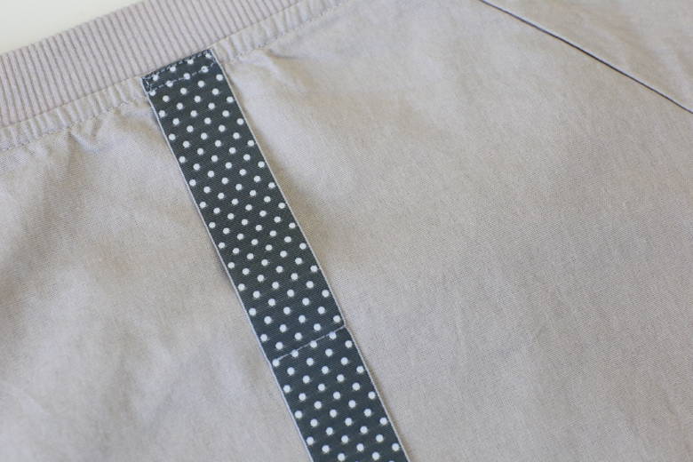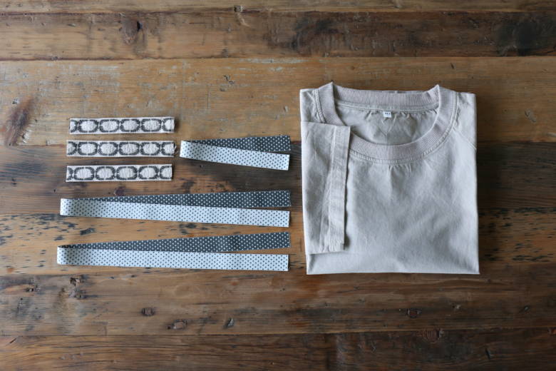 今回、私はリースのグレージュ(17cm×3本)とリバーシブルのグレードット(袖用65㎝×2本・後ろ用35㎝)を使いました。