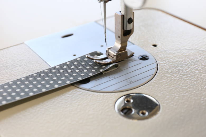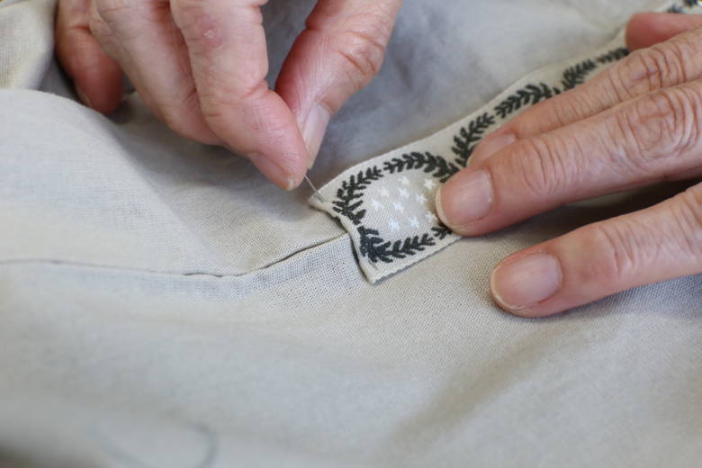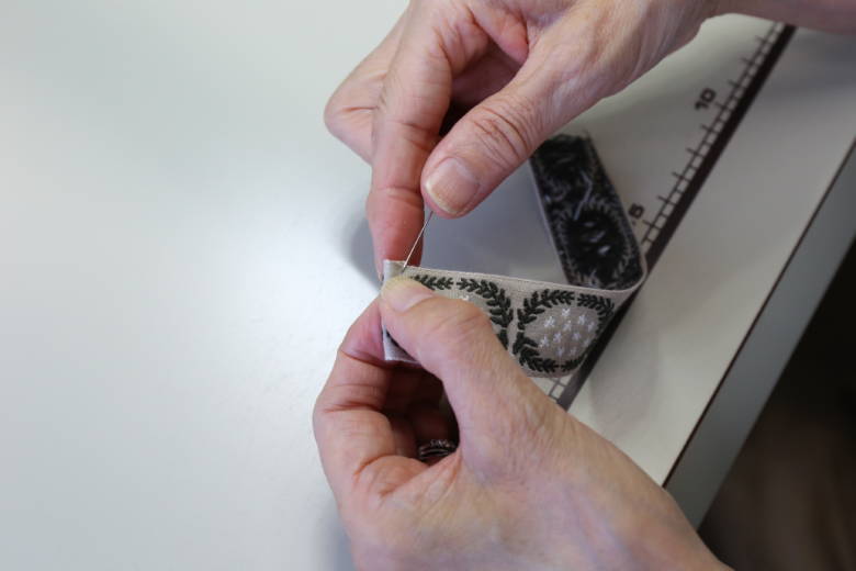 リボンの端を1cmほど折り曲げて縫い付けます。