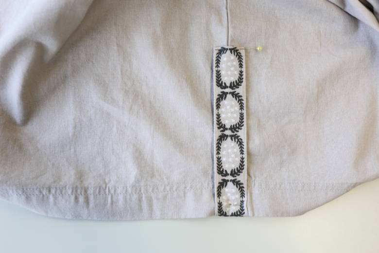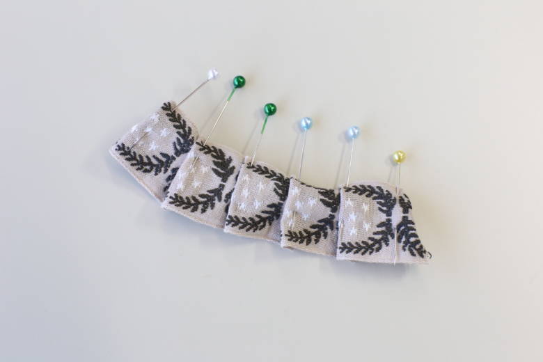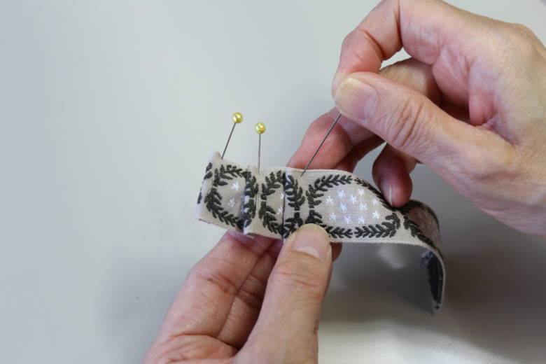 次は、サイドへのリボンの取りつけ。ここもリボンの端は1cmほど折り曲げて待ち針で止めます。