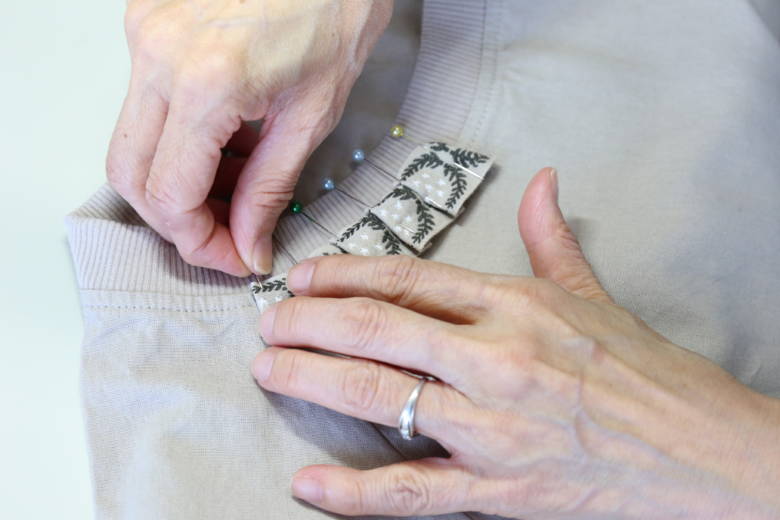 縫い付ける位置を決めたら、プリーツが戻らないように指で押さえ一度待ち針を抜き、再度、プリーツを服生地を一緒に待ち針で止めます。
