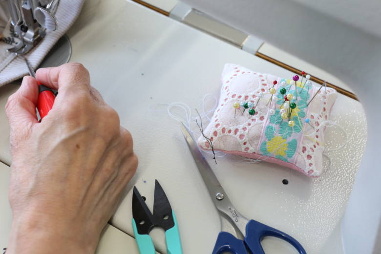 そして、クシュクシュを作るためのミシン糸を、先のとがった糸切りハサミや、リッパーで切りながら抜いていきます。