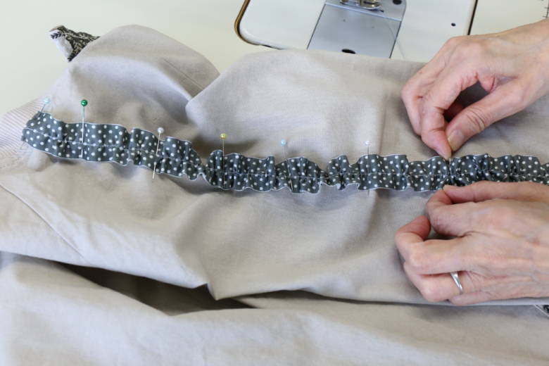 待ち針を1本抜き、指で(目打ちで)クシュクシュを押し込みながら縫製していきます。
