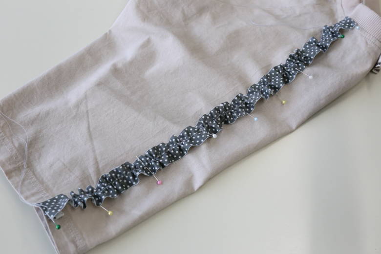 この仮止めが意外と肝心で、完成形をイメージしながら、プリーツが大体均一になるようにクシュクシュを広げたり、縮めたりしながら約5cm感覚で仮止めしていきます。