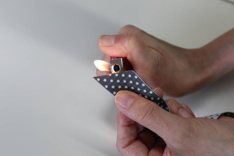垂らす方のリボンの端は、ドットに合わせて斜めにカットし、解けてこないようにしっかり目にライターであぶります。