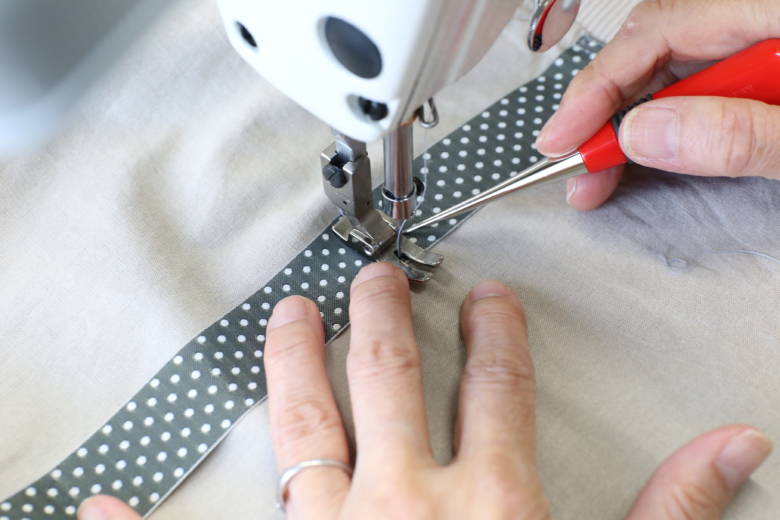指で(目打ちで)プリーツが戻らないように抑え、待ち針を抜きながら、ゆっくり縫います。もちろんはじめと終わりには返し縫してくださいね。