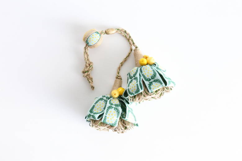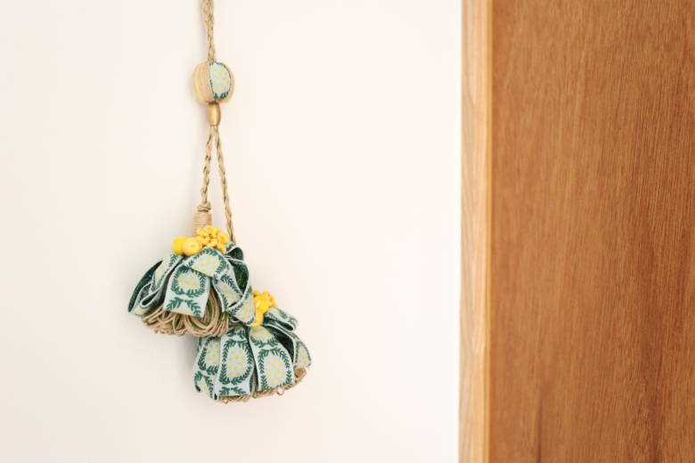 タッセルの中にもリースの緑に合わせた緑の紐を使用されていますが、三つ編みされた紐の中にも緑色の紐を一緒に編まれていたり、黄色のボンボンはよ~く見ると薄い黄色と濃い黄色の2色を使用されていたりと本当に細かいところまでこだわりが詰まった作品でスタッフ一同感動するばかりでした。