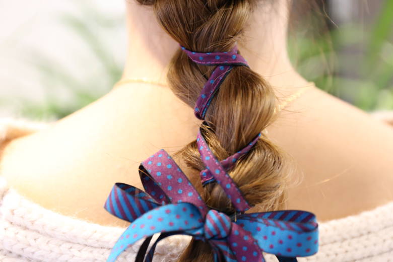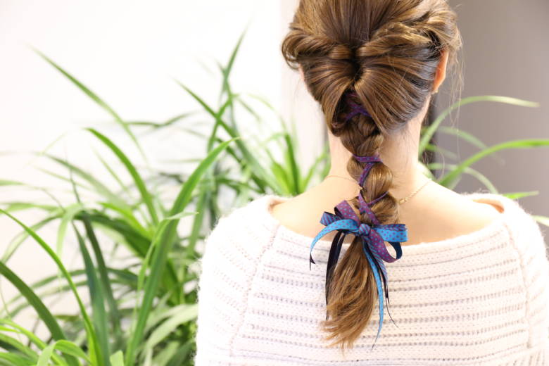④三つ編みした上からワイヤーポニーを巻いて、2色のリバーシブルリボンを2本まとめて蝶々結びしてリボンを広げて完成です!!