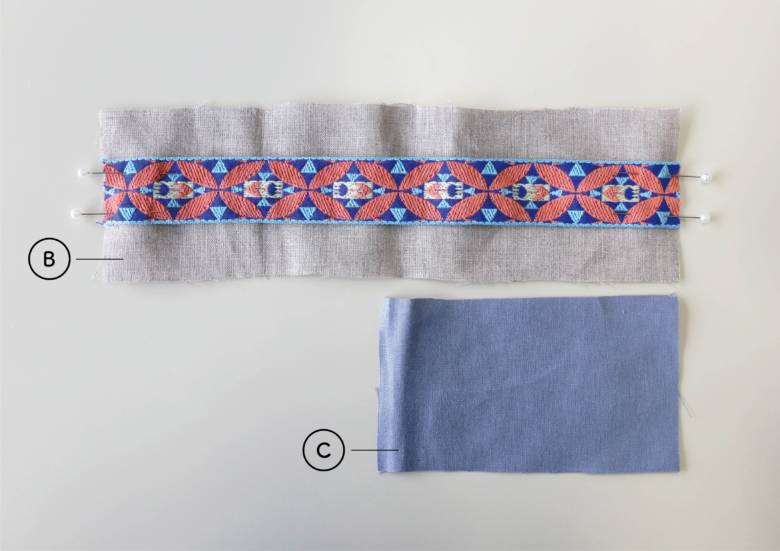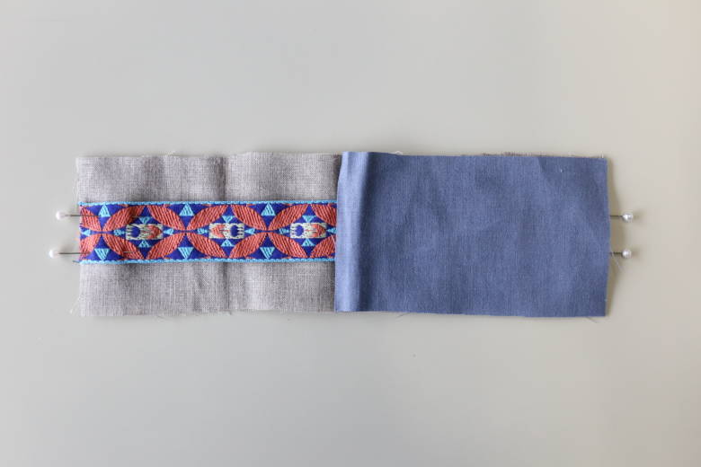 まず、Ⓑの生地の真ん中にチロルリボンを左右にまち針で止めます。