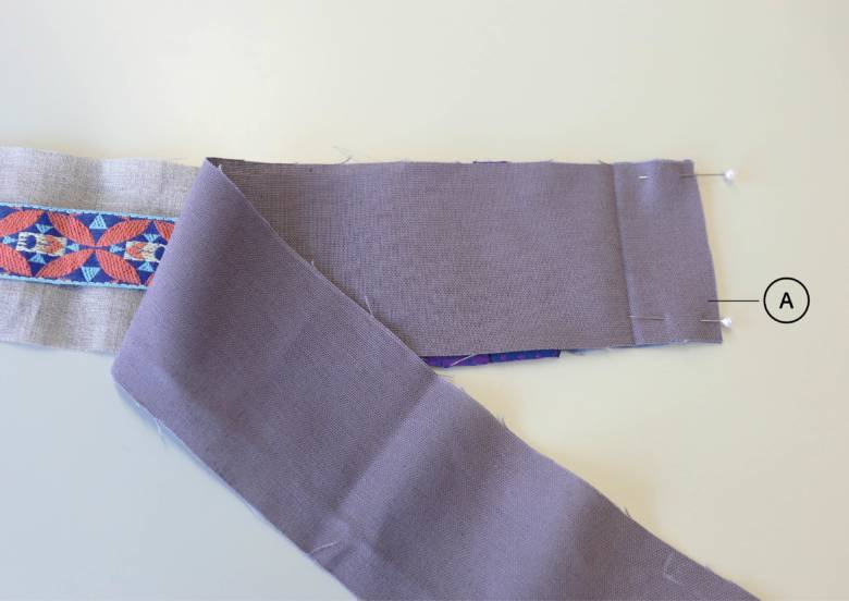 Ⓒ生地に、Ⓑ生地との境目からリバーシブルリボンを折りたたみながらまち針で留めていきます。