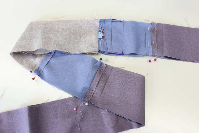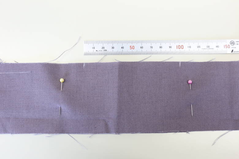 縫いつなげた表裏2枚の長い布を、まち針でぐるっと留めていきます。表生地・裏生地の生地をつないだ部分がずれないように気を付けましょう。