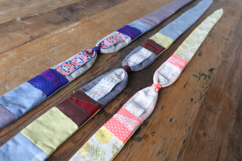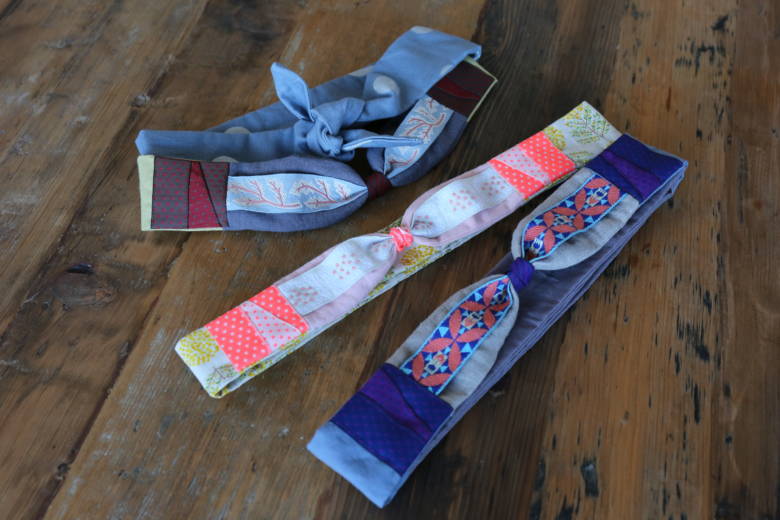 今回ベースの生地を3色使用しましたが、1色の生地にお好きなチロルリボンやリバーシブルリボンを縫い付けてもとても可愛いターバンが出来ますよ。