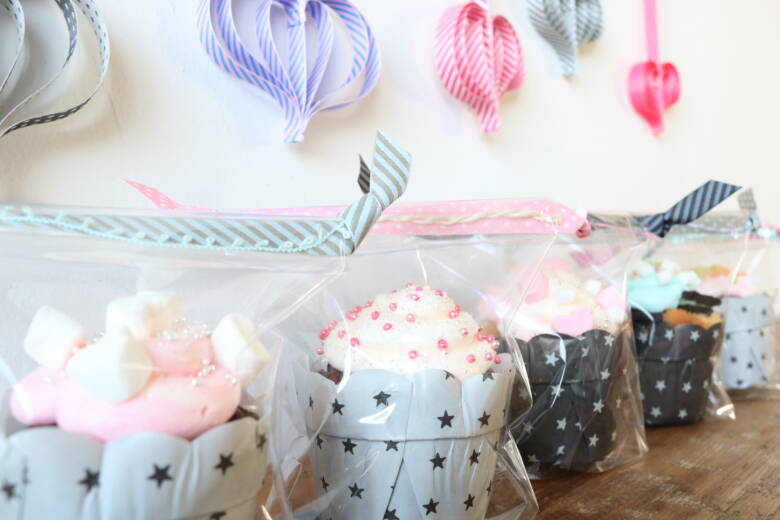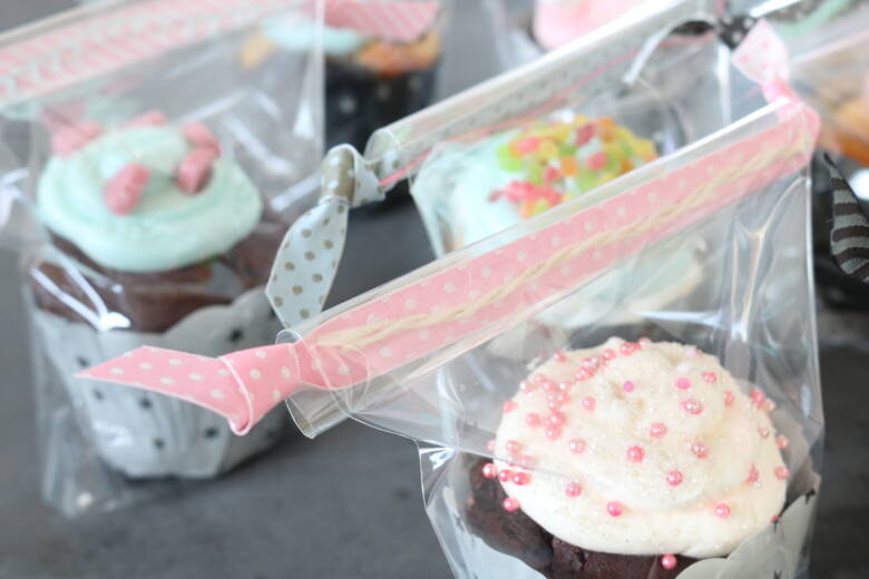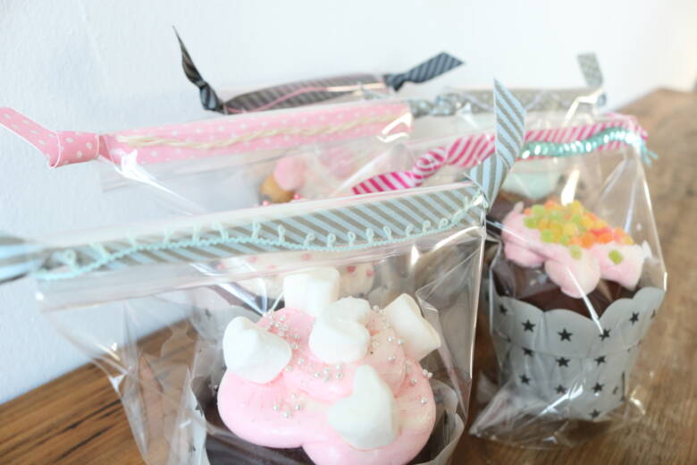 ①透明のラッピング袋にカップケーキを入れて、口をクルクルと折り曲げてセロテープで止めます。