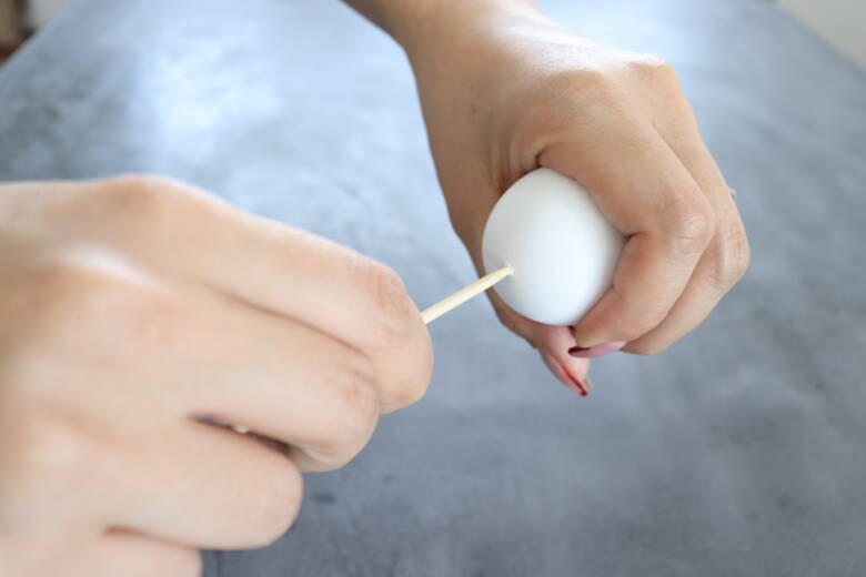 ①卵のお尻の穴の開いてる部分に、竹串を指します。