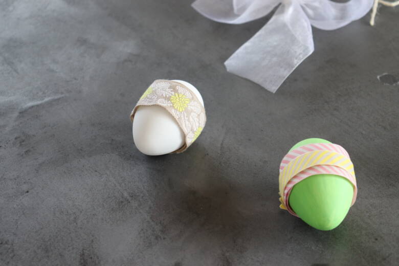 ③乾いた卵にリボンを巻きたい部分にセメダインを塗ってお好きなリボンを巻きます。