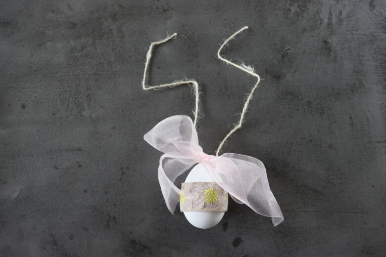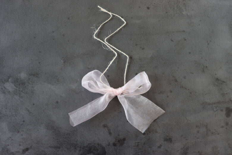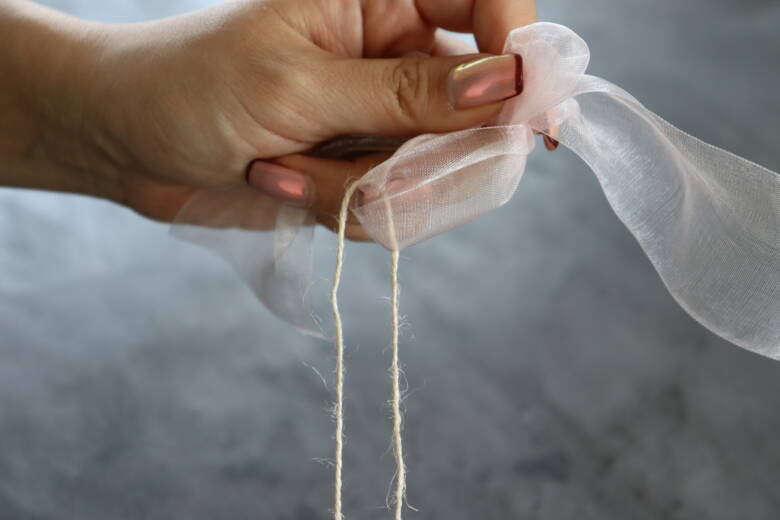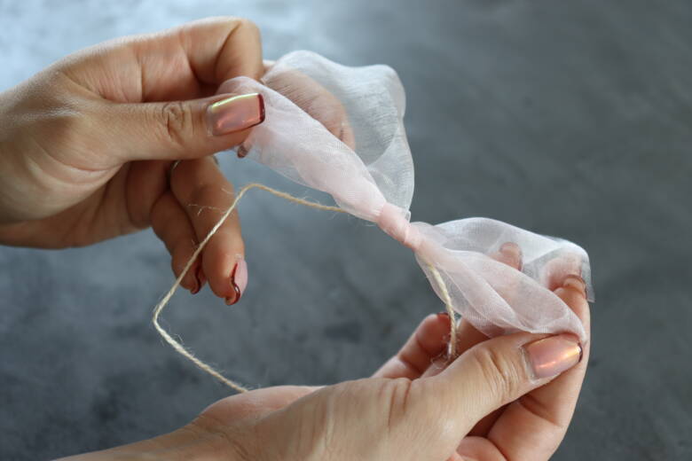 ④卵の上に付けるオーガンジーorチュールリボンを左右折りたたんで持ち、間に麻紐を垂らして一つ結びします。(ちょうちょ結びのようになる)