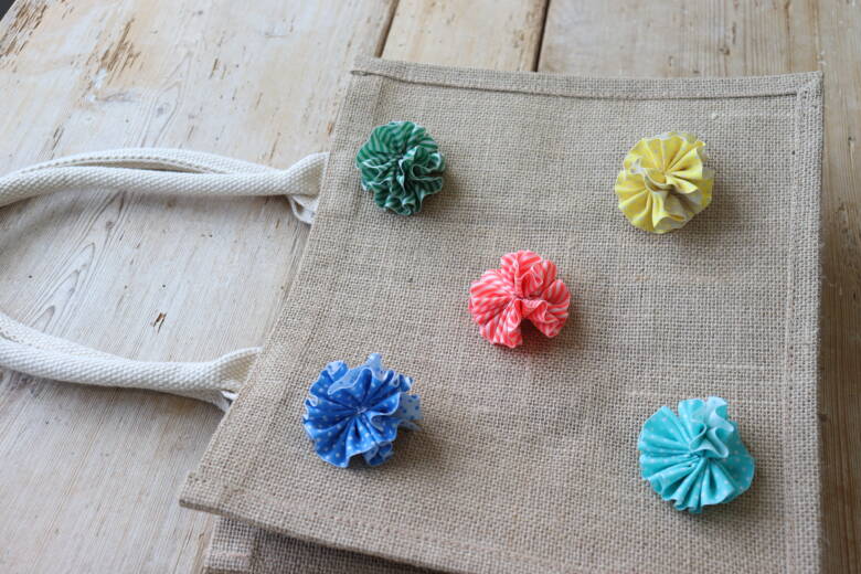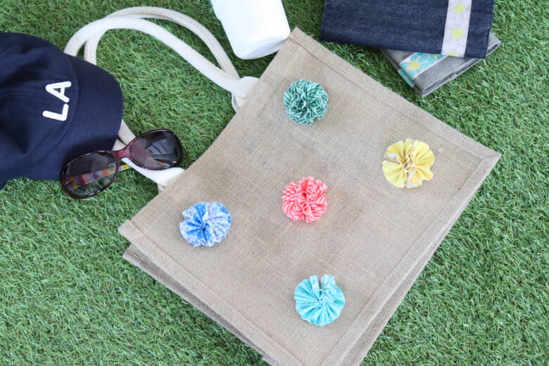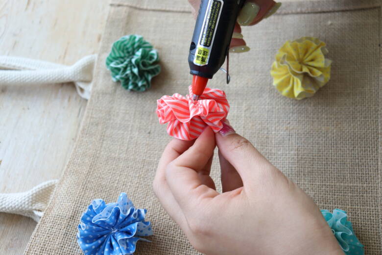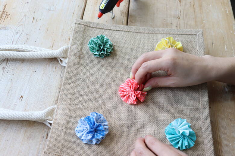 ④グルーガンで、無印良品「ジュート マイバッグB5」 のお好きなところに付けて完成!!