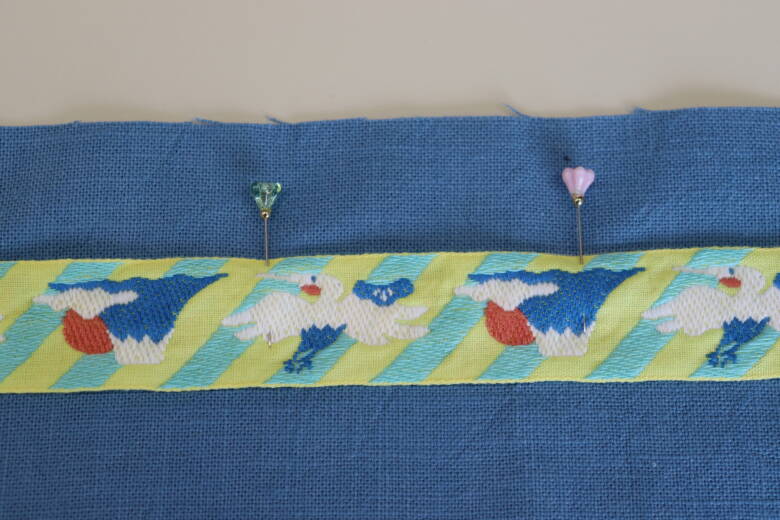 印の位置にチロルリボンを置き待ち針で止め、リボンの上下を縫います。
