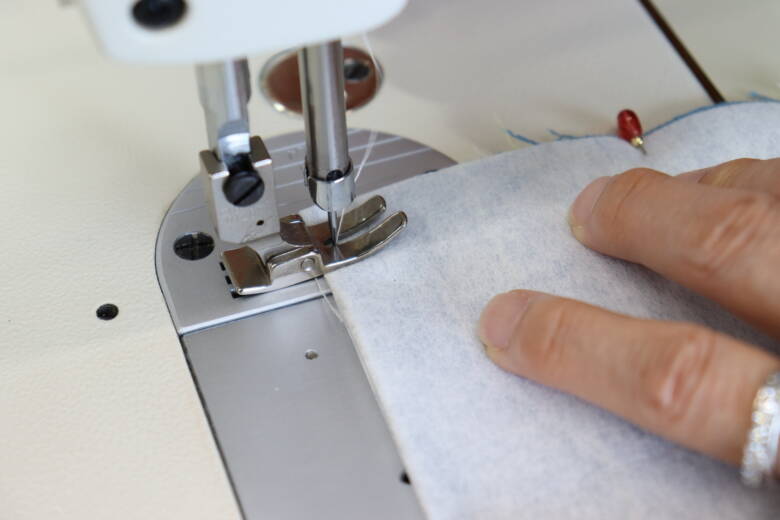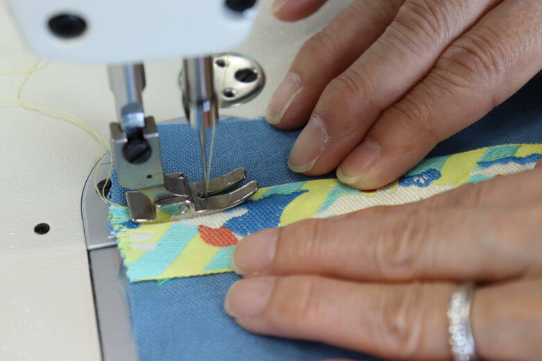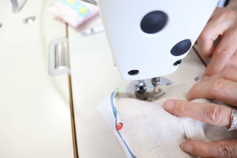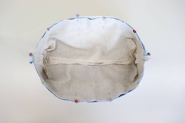 表生地と裏生地を中表にして口の部分を待ち針で止めて、ぐるっと一周を縫います。