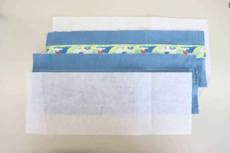 2枚ともチロルリボンを付けたら、表生地を中表にして更に不織布を上下に置き4枚一緒に、上部以外「コの字」に縫います。