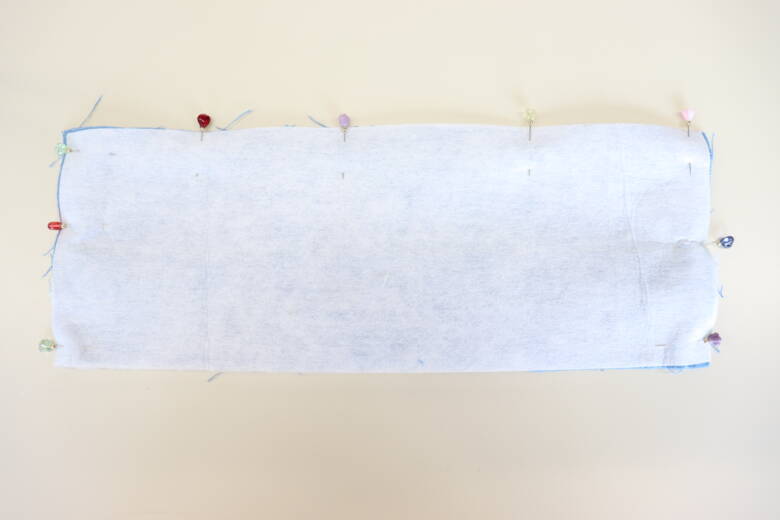 表生地の脇縫いした部分(左右2か所)に、二つ折りにした「リバーシブルリボン」を待ち針で止めます。