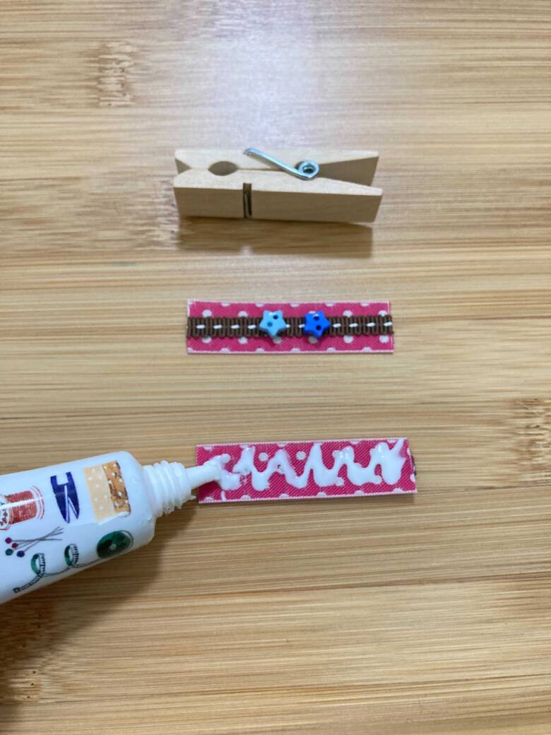 ④下記写真のようにリバーシブルチロルにボンドを塗り、ピンチの上に貼ります。